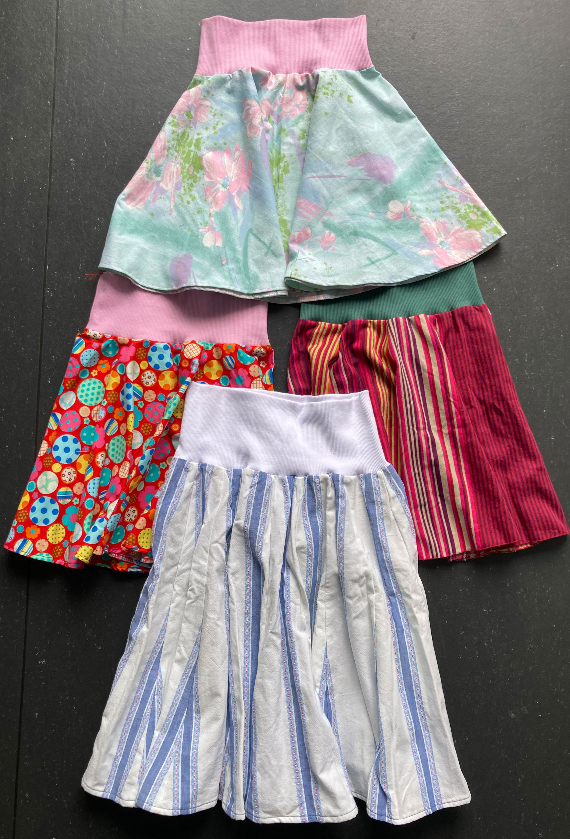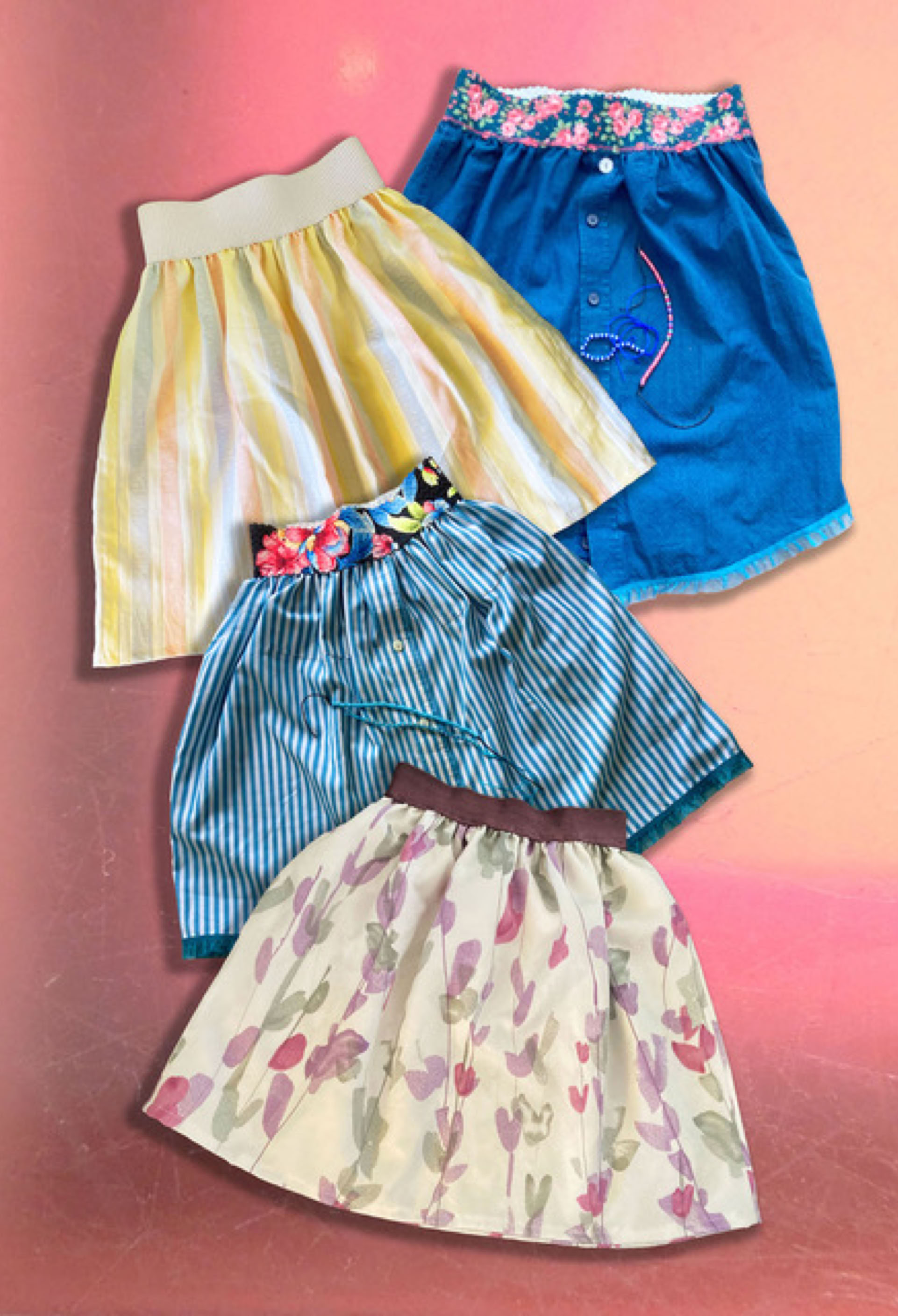 Ich schneidere aus alten Hemden, Blusen und Kissenbezüge Röcke mit Gummi- oder mit Bindeband. Beim Upcycling bleibt das ursprüngliche Material erhalten, es erhält aber eine neue Funktion und entfaltet eine neue Ästhetik.